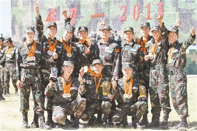 2013年,某训练基地。7天赛期内,极限越野、武装伞降、搜索排爆等实战课目密集上演,全军特战精英激烈角逐,该团勇夺8金5银6铜共19枚奖牌,雄居榜首……