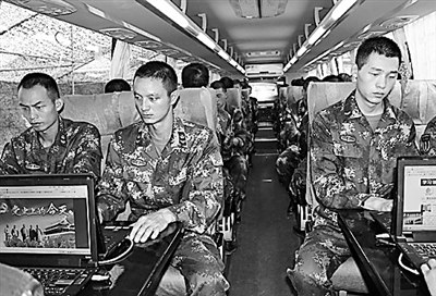 在跨区机动、野外驻训期间,各部队还利用“野战多功能网络车”,通过安装卫星多媒体接收机、大屏幕高清数字液晶电视、视频会议系统和KTV系统等方法接入局域网,即使身处戈壁大漠,也可网上冲浪。