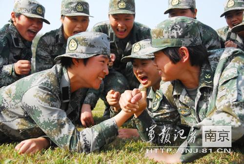 10月24日,南京军区某部新兵陈佳玲(左)与班长胡婷婷扳手腕。