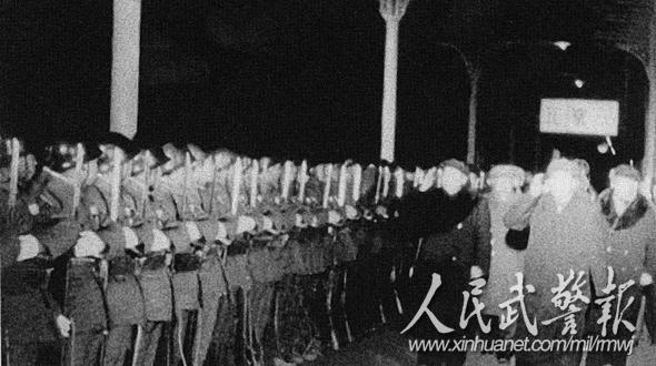 毛泽东主席(右二)检阅担负警卫任务的公安部队官兵。 图片来源:人民武警报