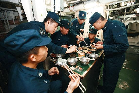 官兵一起吃水下“快”餐。中新社2013年10月27日发。