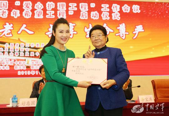 顾秀莲委员长为刘一祯颁发老年希望工程形象大使荣誉证书。(郭幸福摄影)