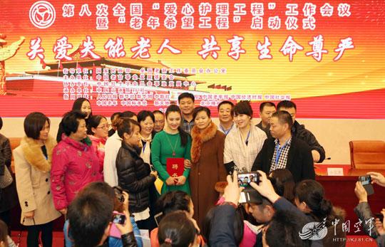 全国各地的爱心护理会议代表争相和形象大使刘一祯合影留念。(郭幸福摄影)