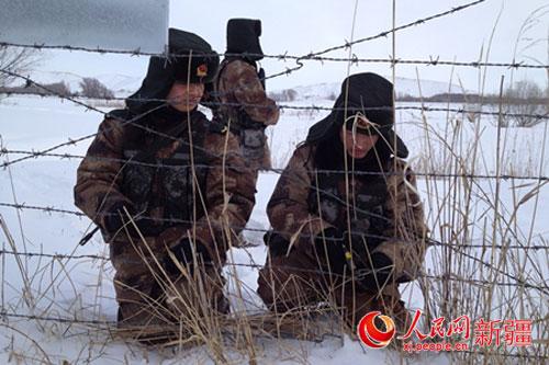 新疆哈巴河边防战士踏雪巡边加固铁丝网(图)