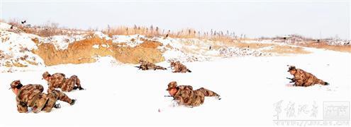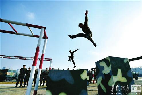 济南军区某部强化训练:持枪卧雪 腾空越障(图)