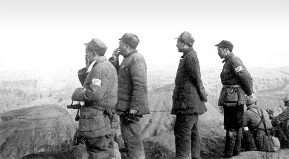 彭德怀(左二)、习仲勋(左三)等在青化砭战场上