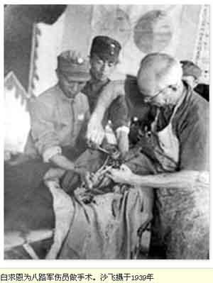 在沙飞的眼里,白求恩大夫身上最可宝贵的东西,就是他对中国人民的民族解放斗争有着深切的同情,对中国共产党和八路军带领广大民众艰苦奋战的精神充满了敬意,同是1939年在五台山松岩口所拍摄的《白求恩和八路军战士在一起》《白求恩和自卫队员合影》等照片,就很好地表现出了白求恩大夫的这种思想感情。前者拍的是白求恩大夫站在八路军战士中间共同听报告,后者拍的是白求恩大夫和肩扛梭镖的自卫队员一起站岗放哨。当然,沙飞在表现白求恩大夫崇高精神的时候,更多地还是拍摄了其所开展的各种医疗活动真实地记录了白求恩大夫在五台山松岩口,想方设法改变根据地的医疗条件,工作中对同志极端热忱,对技术、业务精益求精,特别是他以忘我工作的献身精神,奋力抢救八路军伤病员等种种感人的场面。除此而外,沙飞在山西还为白求恩大夫拍有许多富于生活情趣的照片,如《白求恩在工作余暇以樱桃与村中女孩逗玩》(摄于1939年五台山松岩口)等,加上在河北拍摄的部分,可以说完整地勾画了白求恩大夫在晋察冀边区一年多活动的轨迹。正是在这样频繁的接触中,沙飞与白求恩大夫也结下了深厚的同志谊、朋友情。1939年11月12日,白求恩因抢救伤员感染中毒不幸逝世后,即在遗嘱中将心爱的“莱丁那”相机留给了与自己相处甚洽的沙飞。(李红兵)
