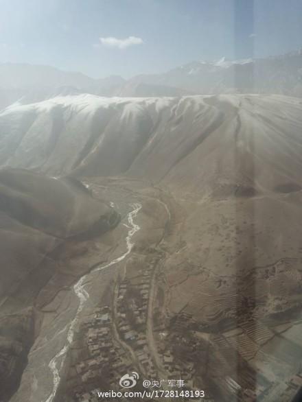 随着直升机继续爬升,13时05分,直升机飞上海拔近5000米的震区。记者从直升机上看到,高原雪山脚下散落部分村庄,从空中看,群众房屋倒塌情况不太严重。