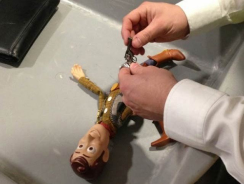 报道中公布的照片便是该男子事后发在网上的。照片中,安检人员居然在给胡迪脱鞋检查。据悉,该乘客的儿子十分喜爱胡迪这个形象,因此在旅游时便带上胡迪来拍照留念。但是令人大跌眼镜的是,机场竟然认为胡迪身上佩戴的小枪是“武器”,具有危险性,并将其没收。