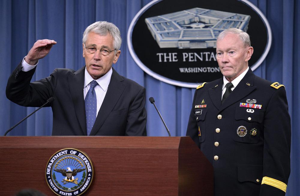 2月24日,美国国防部长哈格尔(左)与参谋长联席会议主席邓普西举行记者会,宣布大规模裁军方案。