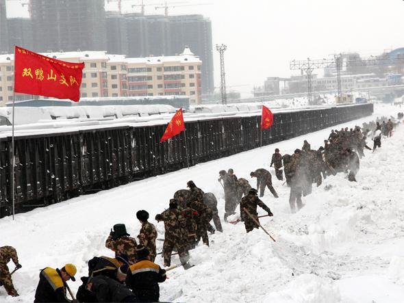 日前,黑龙江省东部地区突降暴雪,持续降雪量达到30多毫米,铁路运输也受到较大影响,厚厚的积雪将铁轨全部掩埋。为确保铁路“大动脉”的安全运行,武警黑龙江省总队双鸭山市支队320名官兵,以雪为令,紧急出动,拿起铁锹,步行一个多小时,赶赴火车站救援现场,协助铁路部门清理站内积雪。