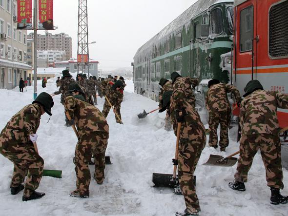 在火车站内,厚厚的积雪已完全将铁轨全部覆盖,火车驶来,只能看见车身。为尽快实现铁路列车正点安全运行,官兵们沿着铁轨一字排开,拿着铁锹和麻袋,一边铲一边往外清理积雪。虽然室外的温度已经降至零下十一二度,可官兵们全然不顾天气寒冷,衣服、帽子全都湿透,脊背上都结起了冰花,干得热火朝天。经过官兵们近10多个小时的奋战,车站内5公里长的积雪全部清理完毕,铁路大动脉全线畅通,为当地群众开辟了一条条方便出行的安全道路,树立了武警官兵在人民群众当中的良好形象,官兵们用自己的实际行动践行了武警部队全心全意为人民服务的宗旨。(李欢欢)