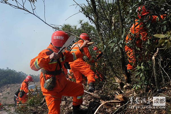 武警云南省总队昆明市支队200多名官兵,于9日9时55分紧急出动,迅速赶赴火场一线增援。官兵每人背负30多公斤的灭火装备一边向山顶火场一线攀爬,一边用砍刀开路。12时许,到达起火山顶的东侧时,滚滚浓烟直袭官兵,各种燃烧的异味呛得他们喘不过气。但是官兵没人退缩,不顾火苗烧破衣服,浓烟熏得泪流,甚至手脚被划破流血,一次次向火魔发起攻击。