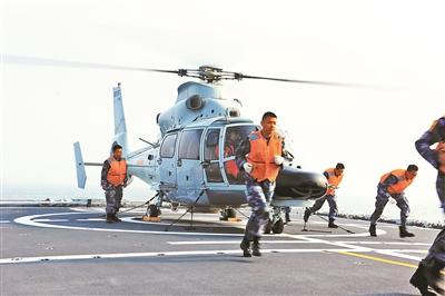4月23日,参加演习的中方导弹护卫舰烟台舰上的舰载直升机紧急起飞供图/新华社