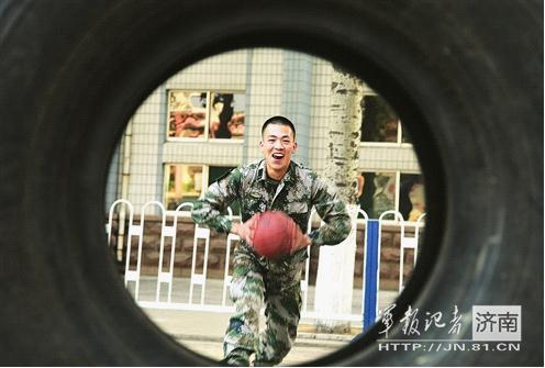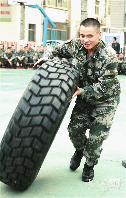 济南军区某部开展主题教育活动 比赛推轮胎(图)