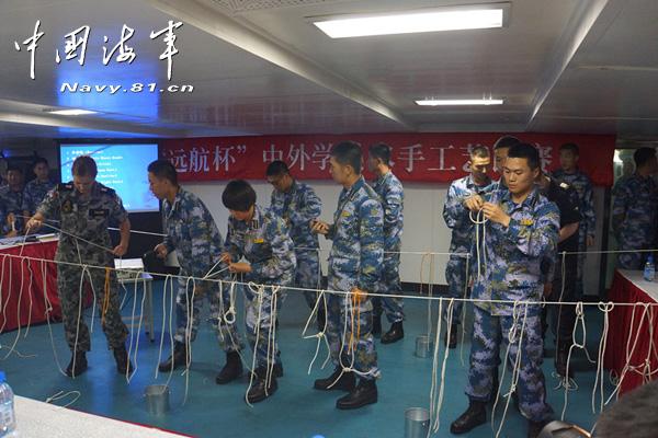 25名中外海军学员在郑和舰上进行水手工艺赛(图)