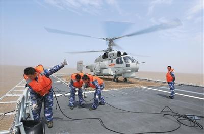 22日,航空兵地勤人员在郑州舰上准备直升机冲洗车。新华社发