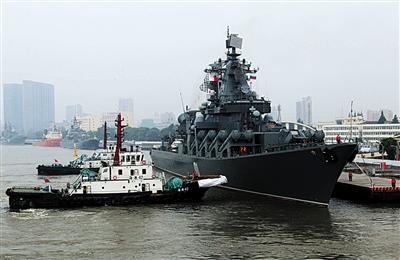 22日,参加军演的俄海军“瓦良格”号导弹巡洋舰驶离上海。新华社发