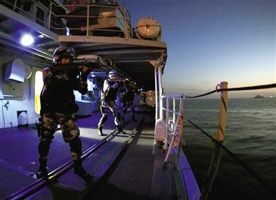 5月22日晚7时35分,东海,参加当天中俄联合军演的宁波舰特战队员进行锚地防御演练。拍者 孙阳