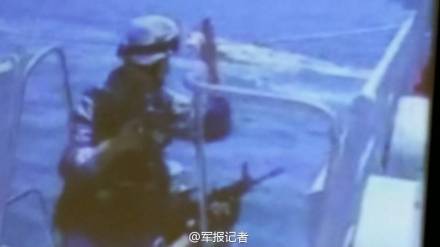 中新网5月23日电 据中国军网记者频道官方微博消息,23日11时20分许,全副武装、装备精良的中俄特战队员分别从郑州舰、瓦良格舰乘小艇,高速驶向被劫持商船,准备登临实施解救行动。(记者周猛)