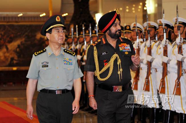 中新网7月3日电 据国防部网站报道,7月3日,中央军委委员、总参谋长房峰辉上将今天上午在八一大楼与来访的印度参委会主席兼陆军参谋长辛格上将举行会谈。会谈前,房峰辉为辛格举行欢迎仪式,并陪同检阅中国人民解放军三军仪仗队。