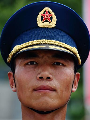 记者能进入封闭的训练场地,近距拍摄和采访这些军中娇子机会难得。在混凝土铺设的练兵场40多度的烘烤中,记者身穿短袖薄衣端个相机,在队列中穿插了几次已是汗流浃背。官战们穿着全套礼服,端着刺刀、脚蹬皮靴、正步向前,需要多么顽强的意志。正步伴随着每一个士兵走完他的军旅生涯。一个仪仗兵队员在服役期间走出的正步,相当于一个两万五千里长征。您瞧,全队官兵3个小时昂立于烈日之下,真可谓铁打的英雄汉,令人敬佩不已!