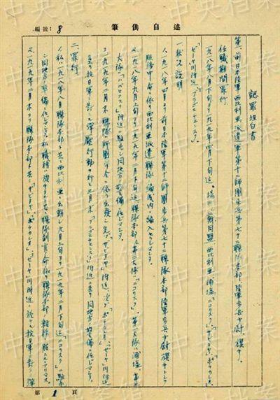 在其自供中,他称,曾经将活着的中国人投入毒瓦斯室试验;强奸中国妇女数十名;在湖北襄樊一战中,杀害重庆军士3500名。