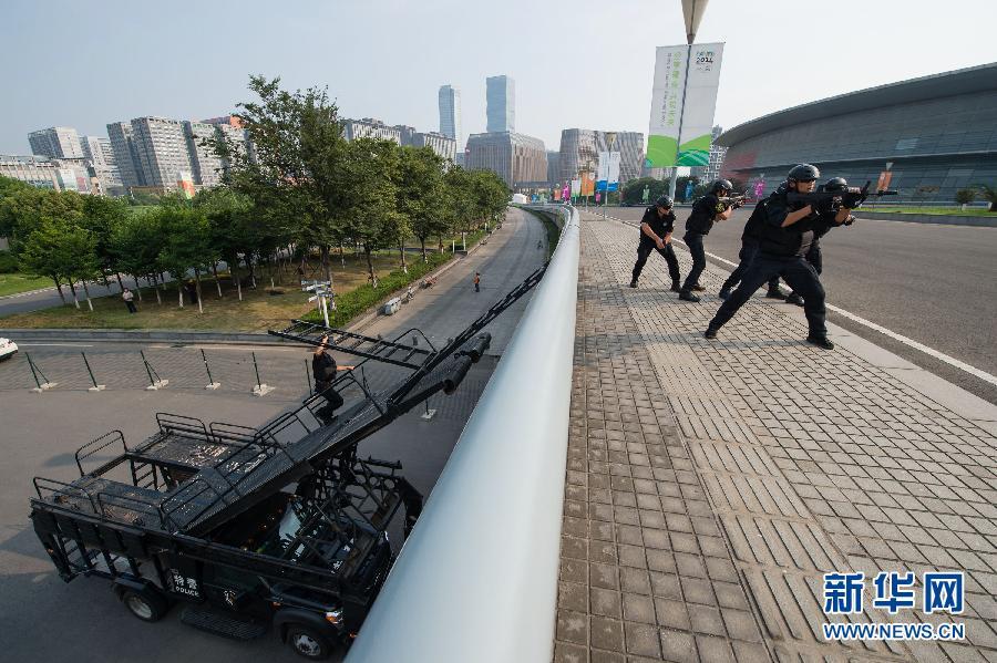 在防暴恐演练中,南京警方迅速抵达现场,快速处置模拟暴恐事件(7月21日摄)。 7月21日,2014年第二届夏季青年奥林匹克运动会举行首次联调联试,南京警方举行例行防暴恐演练,以筑牢青奥会安保坚固防线,保障青奥会期间社会环境安全稳定。新华社记者李响摄