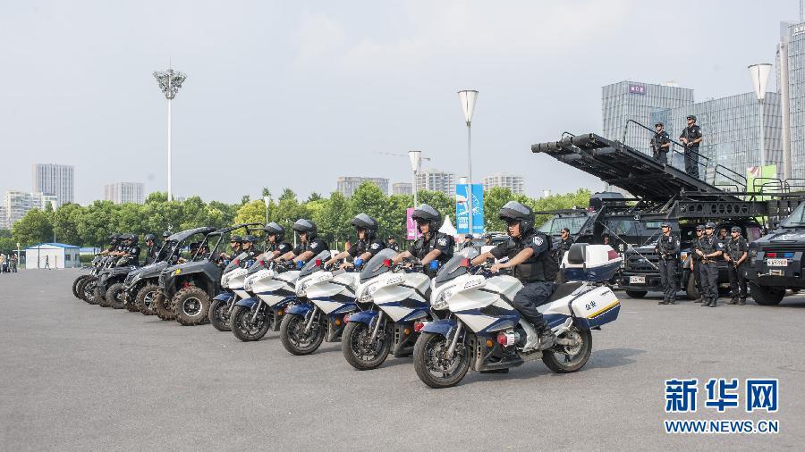 在防暴恐演练中,南京警方装甲车、云梯攀登车、全地形车及特警队员严阵以待(7月21日摄)。 7月21日,2014年第二届夏季青年奥林匹克运动会举行首次联调联试,南京警方举行例行防暴恐演练,以筑牢青奥会安保坚固防线,保障青奥会期间社会环境安全稳定。新华社记者陈益宸摄
