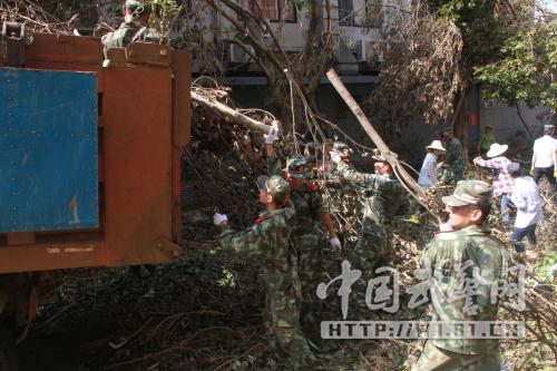 19日台风过后,城市满目疮痍,恢复重建迫在眉睫。支队官兵来不及片刻休整,又主动请缨投身到驻地建设中。他们顶着烈日连续奋战,数日来重复着割锯树木、搬运杂物、清理垃圾等劳动,有的累倒在道路上,稍作休息接着干;有的自家受灾,也无暇回去看一眼。