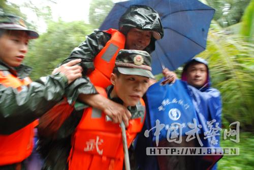 “海口市秀英区业里村积水严重,全部村民被困,请求武警迅速支援……”18日晚20时30分,省三防办的紧急求援电话到达武警值班室。灾情就是命令。前指张彬元副支队长迅速抽调40名精干力量组成第一救援梯队,冒着暴风雨紧急赶赴业里村救援。车窗外,台风怒号、大雨倾盆,一棵棵大树倒在公路边、一个个广告牌随风乱舞。突然,一声巨响,一颗两人合抱的大树被台风连根拔起,倒在了救援车辆正前方2米处。惊出一声冷汗的同时,“车走不了,怎么办?”张副支队长随即展现出了一个20多年老兵的沉稳和果敢:“所有人员下车,携带装具,跑步前进!”他用大家熟悉的大嗓门下达命令。就这样,救援官兵不顾个人安危,冒着随时被坠物砸中的危险,踩着齐腿深的浊水,朝着目标跑步前行。21时05分,救援官兵终于到达业里村。此时,村庄已经成为一片汪洋,不少瓦房开始摇摇欲坠。兵们来不及喘口气,手拉着手组成人墙向着被困群众步步前进,用人体肉盾将群众一个个解救至安全区域。19日凌晨1时许,经过4个多小时的连续奋战,210余名被困群众全部转移。