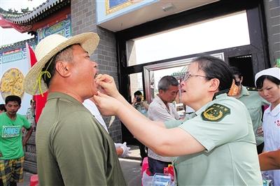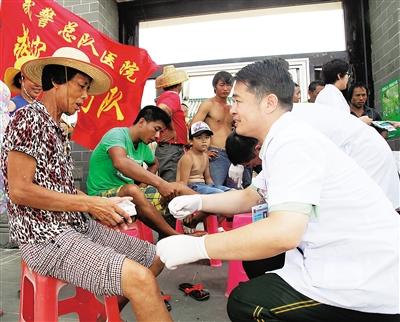 台风过后,武警海南省总队医院每日派出3个分队分赴灾区为受灾群众进行义务巡诊、发放药品和灾后防疫消毒工作。