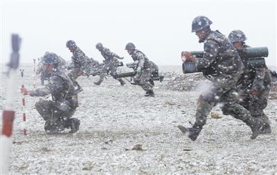 8月11日,昆仑山腹地突降大雪,气温骤降。兰州军区某旅抓住这一有利练兵时机,组织步兵分队进行反坦克火箭实弹射击训练。图为官兵冒雪快速占领阵地