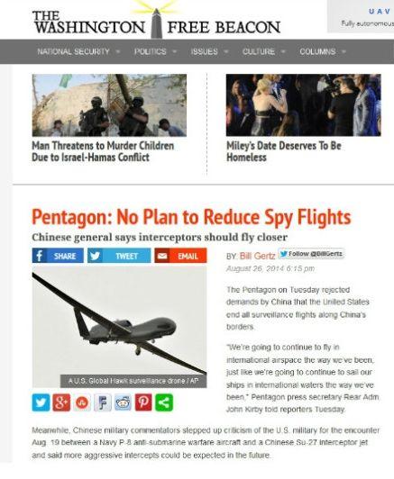 据美国《华盛顿自由灯塔》网站8月26日报道,针对上周中美军机接近事件,中方要求美国停止对华抵近侦察一事。美国军方本周二指出,美方将继续和过去一样在“国际空域”(自由)进行飞行,正如美方船只和过去一样在“国际水域”(自由)航行。