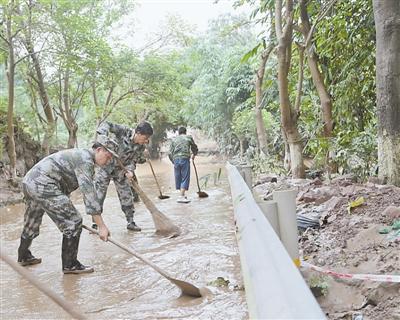9月14日,重庆市渝北区人武部组织官兵帮助群众清除道路淤泥恢复交通。13日,渝北区遭受特大暴雨袭击,5个乡镇13个村社受灾,该人武部组织官兵及民兵400余人第一时间展开救援。 马 雪摄