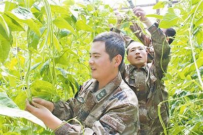 官兵们在温室大棚里采摘豆角。本报记者 孙兴维摄