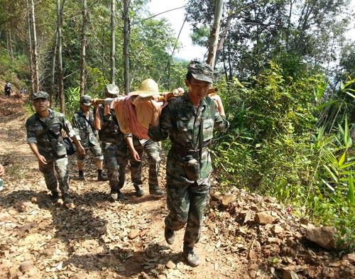 经过征求家人意见,上午11时过,孙运树带着6名突击队员和军医费江抬着老人开始了艰难的跋涉。他们8个人每4人一组,轮番上阵。虽是深秋,但景谷的天气异常火辣,加之山路崎岖,需要翻过一座大山,官兵个个累得满头大汗。在经过一段塌方时,8个人一手撑地,一手举着担架,几乎是爬行着将老人抬过来。老人的儿媳刀学芬见此情景,感动得热泪直流。5公里的山路,官兵们艰难跋涉了2个多小时。这时闻讯的武警8750部队救援官兵也赶来增援,某工兵团也将公路抢通到了离村子5公里多的地方。