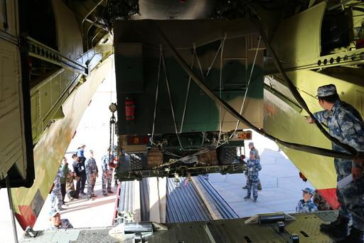 某型投物伞货台搭载战地通讯指挥车进行装机工作。