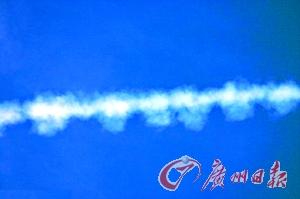 香肠式尾烟 另外,当“曙光女神”横越长空,往往会留下类似香肠状的绳结式凝结尾烟,跟传统飞机有极大差异。(东莱)
