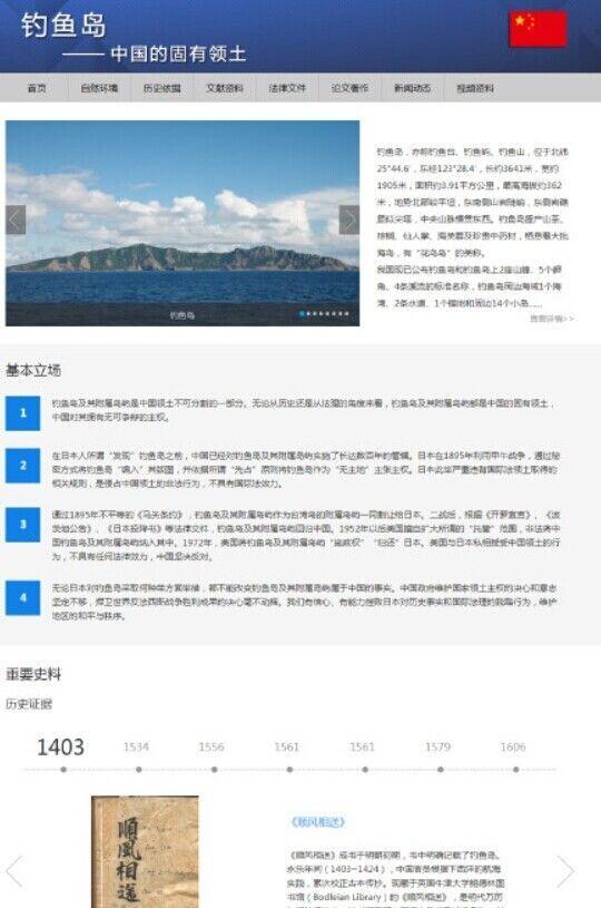 中国国家海洋局网站介绍称,钓鱼岛专题网站主要包括:基本立场、自然环境、历史依据、文献资料、法律文件、视频资料、新闻动态和论文著作等板块,发布了一系列历史文献和法律文件,有力地证明,无论从历史还是法理的角度来看,钓鱼岛及其附属岛屿都是中国的固有领土,中国对其拥有无可争辩的主权。(实习编译:邓琪 远梦 审稿:王欢)