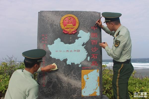 南海三沙边防举行红色登岛仪式 重描主权碑(图)