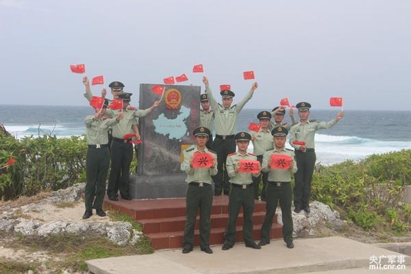 轮换干部和三沙边防派出所官兵在永兴岛石岛主权碑前合影留恋迎接元旦到来。