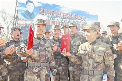 王龙(右)、付月飞(左)拿着荣誉证书与战友们合影。 韩 理摄