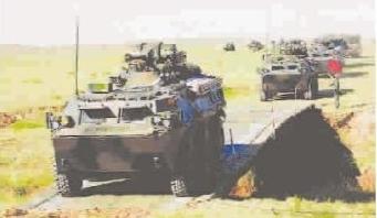 ■ “跨越-2014·朱日和”实兵对抗演习中,“红军”车辆通过临时架设的桥梁