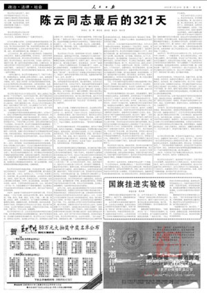 《人民日报》1995年5月29日刊登的长篇通讯《陈云同志最后的321天》,文中记载: