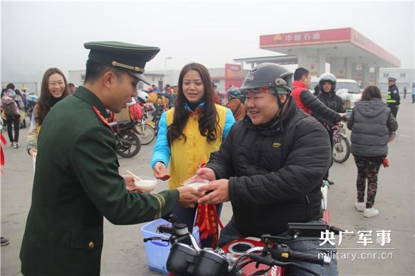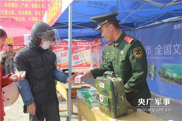 肇庆,作为广东连接大西南的门户枢纽城市,每年春节前后约有100万打工者骑摩托车返回广西、贵州等地。当日上午,有近百辆摩托车停靠在服务点,边检官兵与志愿者们一同为旅客送上一碗碗热粥、一杯杯热茶,用爱心驱散寒意。同时,针对长途跋涉容易让驾驶员出现头晕发冷、手脚麻木等状况,这个站组织医护人员为驾驶员提供医疗服务,并派发安全驾驶单张,为旅客安全返乡出一份力。作为唯一一支连续第三年参与“暖流行动”的驻肇部队,自活动开展以来,该站已帮助群众50人次,协助派发姜粥、热茶300余份,派发文明行驶单张200余份,获得群众一致好评。