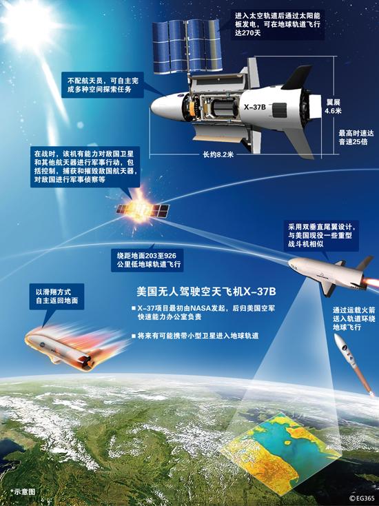 美国的X-37B空天飞机一直处于神秘试验状态,有专家认为,X-37B在实战中可以用于捕获在轨卫星和破坏航天器,是一个不折不扣的太空战武器系统。上图为美国空天飞机X-37B图解。