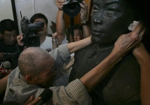 资料图:2005年7月4日上午,在上海四行仓库,杨养正老人用手抚摸谢晋元团长的半身铜像。