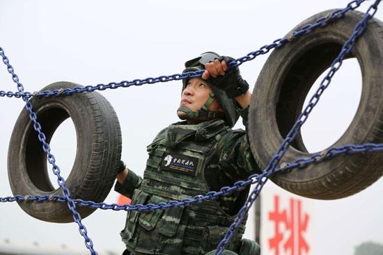 在高塔接力课目中,刘洋率先登入塔顶,利用俯角对100米外4个目标进行射击,用时仅7秒,打破了赛事纪录。