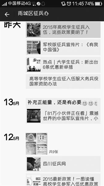 微时代下的青年学生,多为“埋头族”“手机控”。雨城区人武部针对学生们获取信息的习惯性特点,在用好传统宣传方式的同时,也与移动互联网展开对接,开通征兵宣传微信平台,既符合广大90后适龄青年的“口味”,又实现了应征青年与兵役机关的无障碍沟通。